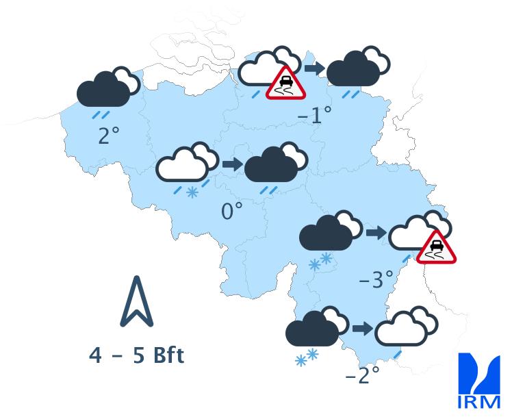 Ce soir et la nuit prochaine, le ciel se couvrira et plusieurs zones de précipitations traverseront notre pays d'ouest en est. Il s'agira de pluie dans l'ouest. Dans la partie centrale du pays, les premières précipitations pourront être très temporairement hivernales (neige/neige fondante, granules de glace ou même pluie verglaçante/se congelant au sol). Elles se transformeront en pluie rapidement. Par contre, dans l'est du pays, ce risque de précipitations hivernales se maintiendra plus longtemps, et même jusqu'à lundi matin en Ardenne où les conditions routières pourront être dangereuses. Les minima, atteints le soir, oscilleront entre -3 degrés en Hautes Fagnes et +3 degrés à la mer sous un vent modéré à assez fort de secteur sud avec des rafales de 40 à 60 km/h, voire 70 km/h en Ardenne.