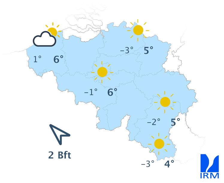 Mardi aussi, le temps sera sec avec d'abord des gelées en beaucoup d'endroits. La grisaille locale cédera la place à un temps souvent ensoleillé malgré des voiles d'altitude par l'ouest. Les maxima seront compris entre 5 et 10 degrés avec les valeurs les plus élevées sur les hauteurs de l'Ardenne. Le vent sera souvent faible d'est ou de direction variable.