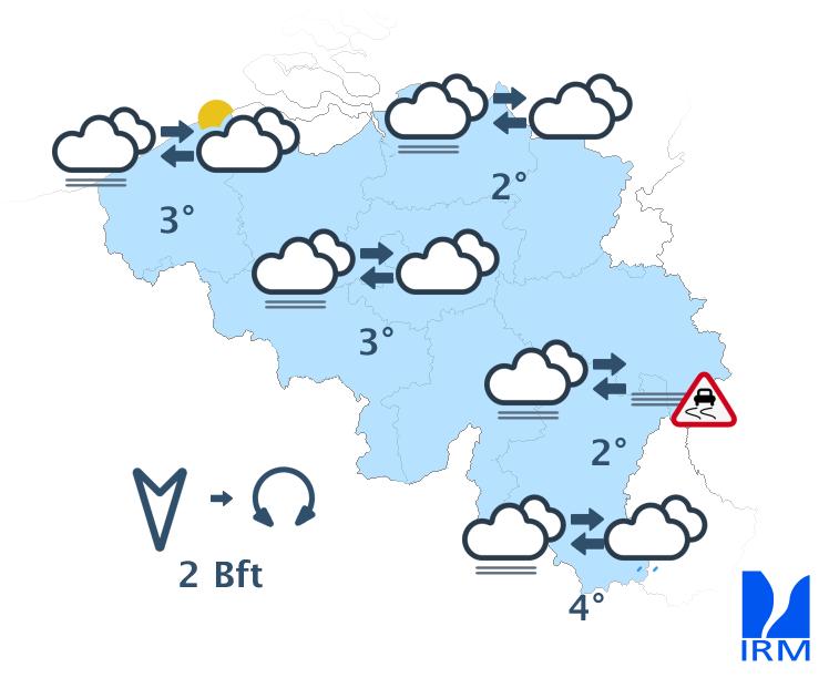 Après midi, le temps restera sec mais très nuageux et brumeux avec toutefois possibilité de timides éclaircies locales, plus probables sur l'ouest du pays. Surtout en Ardenne, quelques bancs de brouillard(givrants) seront à craindre. Les maxima seront compris entre -1 degré en Hautes Fagnes et 4 degrés en plaine, voire jusque 5 degrés le long de la frontière française. Le vent sera généralement faible et variable mais modéré en Ardenne en premier lieu, de secteur ouest à nord-ouest.