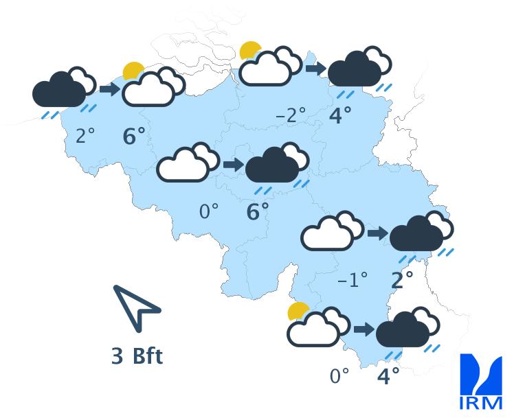 Mardi matin, le ciel sera très nuageux avec graduellement de la pluie de l'ouest au centre. L'Est du pays devrait garder en premier lieu un temps généralement sec avec quelques éclaircies. En début d'après-midi, la zone de pluie concernera l'entièreté du territoire avec possibilité de neige fondante en haute Ardenne. Plus tard dans l'après-midi, un temps sec avec quelques éclaircies reviendront par l'ouest. Les maxima seront compris entre 1 degré sur les sommets de l'Ardenne et 6 degrés en plaine. Le vent modéré de sud-est, parfois assez fort à la côte, deviendra faible à modéré dans l'après-midi et virera au secteur sud.