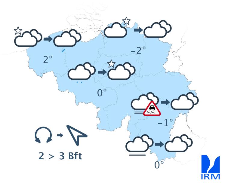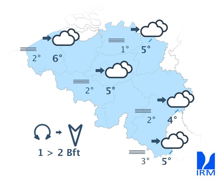 Cette nuit, peu de changements sont prévus avec toujours un ciel très nuageux avec de la brume. On notera aussi toujours un un risque de brouillard (givrant) surtout en Ardenne. Très localement quelques bruines seront possibles mais le temps restera sec sur la plupart des régions. Durant la nuit, quelques éclaircies se développeront mais seront rapidement suivie d'une augmentation de la nébulosité à l'approche d'une perturbation par l'ouest. Vers l'aube, les premières pluies sont attendues dans l'extrême ouest du territoire. Les minima, atteints en début de nuit, oscilleront entre -2 degrés en haute Ardenne et +4 degrés dans l'ouest. Le vent, d'abord faible et variable deviendra modéré de sud-est dans la nuit.