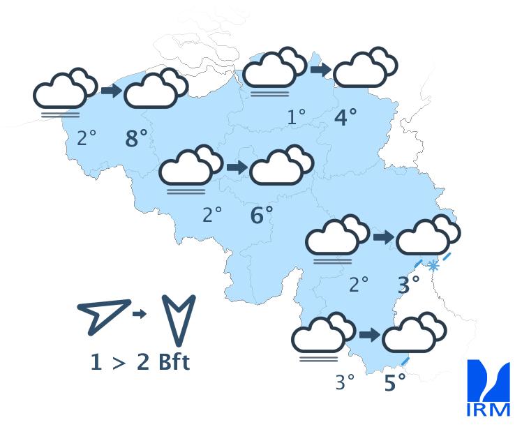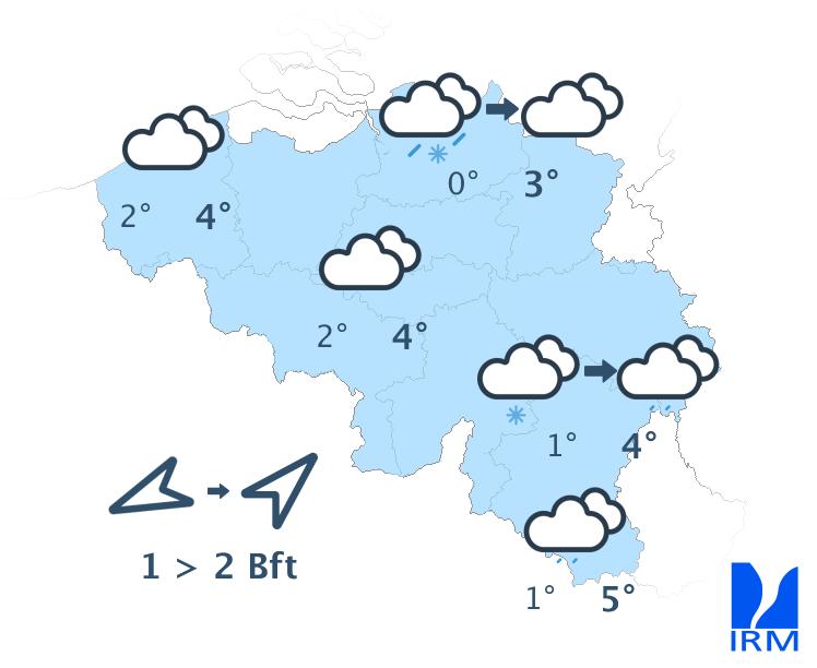 Jeudi, le ciel sera à nouveau très nuageux. Sur le nord-est et l'est du pays, nous prévoyons parfois quelques pluies ou de la neige fondante; sur les hauteurs, il s'agira d'un peu de neige fondante ou de neige. Ailleurs, le temps restera généralement sec. Les maxima se situeront entre environ 0°C en Hautes-Fagnes et 6°C sur l'extrême ouest et sud-ouest du territoire, sous un vent globalement faible de direction variable.