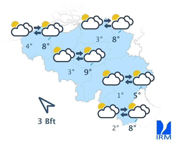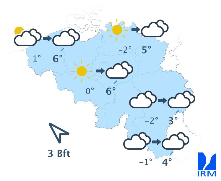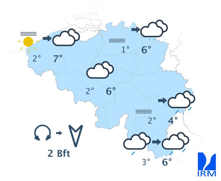 Ce mercredi matin, des éclaircies pourront encore être présentes sur l'ouest. Ailleurs, il s’agira de nuages bas, de brume et de brouillard en divers endroits. En cours de journée, la nébulosité deviendra abondante partout et dans l'après-midi le risque de faibles précipitations augmentera dans l'est du pays. En Hautes Fagnes, il pourra s'agir de neige (fondante). Les maxima seront compris entre 3 et 7 degrés. Le vent, généralement faible, sera d'abord variable, puis s'orientera au nord.