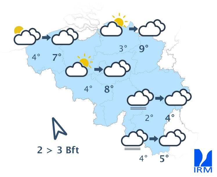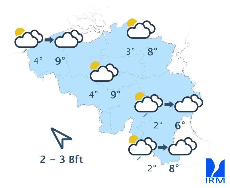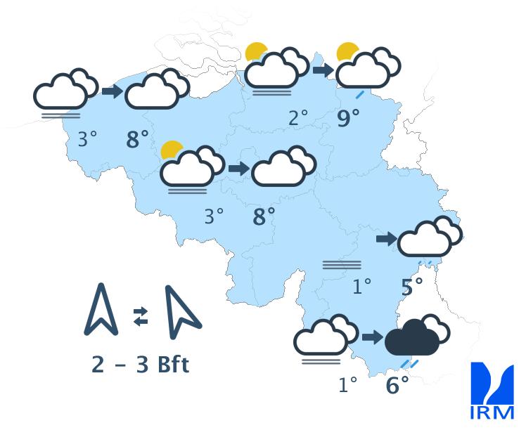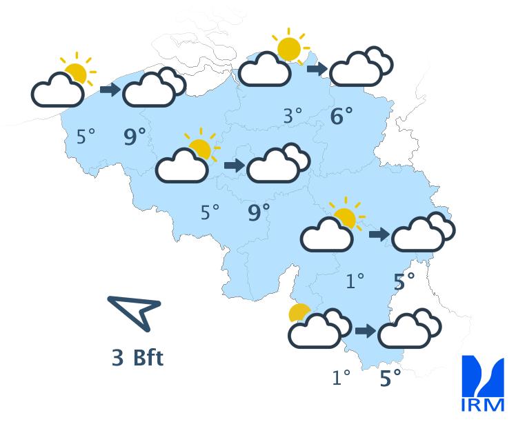 Cette nuit, les éclaircies deviendront progressivement plus larges du Condroz à la Campine et devraient transitoirement s'étendre jusqu'au centre du pays. Ailleurs, les champs nuageux devraient encore dominer même si ils auront tendance à se déchirer en partie. En fin de nuit, des nuages d'altitude aborderont notre territoire à partir du sud-ouest et quelques gouttes seront possibles sur le Westhoek. En outre, des bancs de brouillard (givrant) pourraient se former en Campine et les nuages bas réduiront parfois la visibilité sur le flanc est de l'Ardenne. Les minima seront compris entre -3 ou -4 degrés en Hautes-Fagnes et -1 à +1 degrés sur le centre et +3 degrés sur l'ouest du pays. Des plaques de givre et/ou de glace (sur les parties de routes humides) pourraient localement se former sur la moitié est du pays. Le vent s'orientera au secteur est à sud-est et deviendra graduellement modéré.