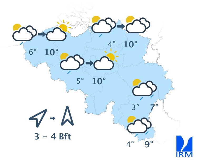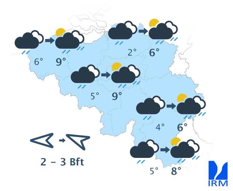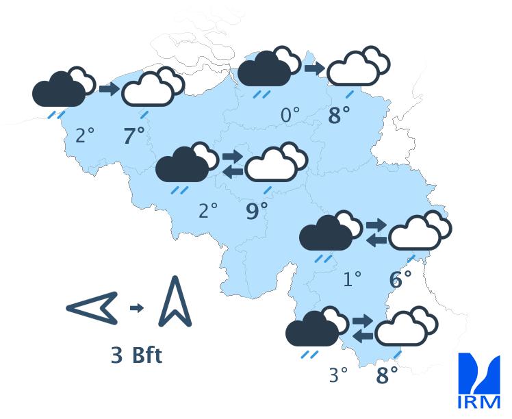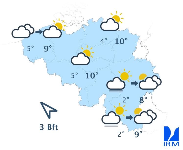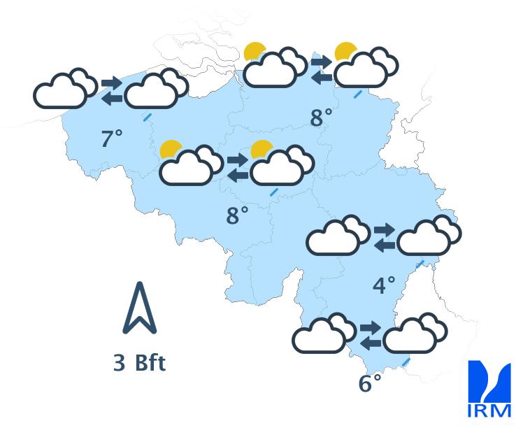 Ce matin, il y aura encore temporairement des éclaircies dans le centre et le nord-est du pays. Ailleurs, le ciel sera gris avec localement de la brume ou du brouillard. Progressivement, le temps deviendra très nuageux partout avec un risque de quelques averses éparses ou d’un peu de bruine. Les températures maximales atteindront 4 à 8 degrés, sous un vent modéré de sud.