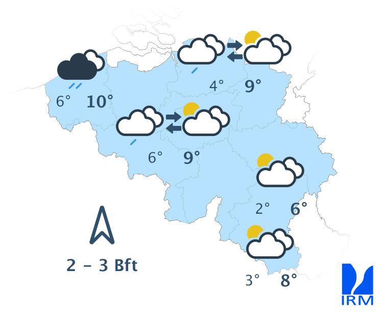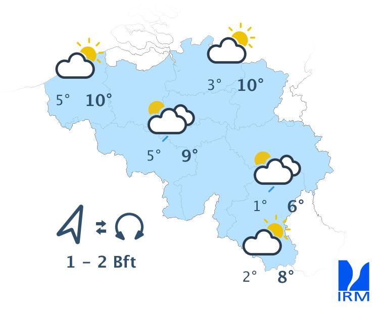 Demain, nous aurons de belles périodes ensoleillées, surtout avant midi. Dans les Ardennes, les nuages bas pourront persister plus longtemps. Au cours de l'après-midi, la nébulosité augmentera à partir du sud-est et de faibles averses locales ne sont pas exclues. Les maxima oscilleront entre 6 et 10 degrés au sud du sillon Sambre et Meuse et autour de 10 ou 11 degrés ailleurs. Le vent sera d'abord faible de sud-est à sud-sud-est. En fin d'après-midi, il s'orientera au secteur est et se renforcera pour devenir modéré.