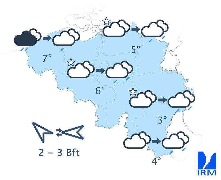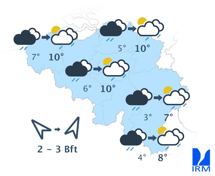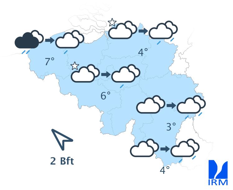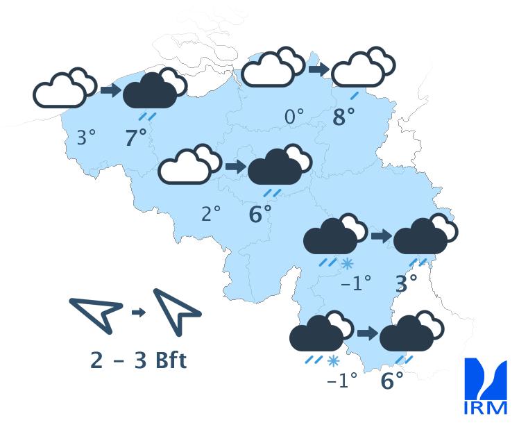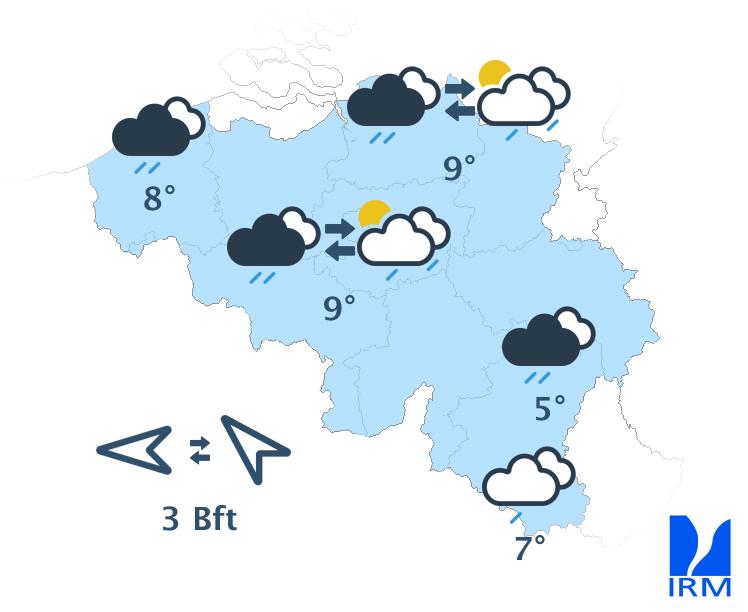 Aujourd'hui, la nébulosité sera abondante avec parfois de faibles pluies ce matin, surtout sur la moitié ouest du pays. Des éclaircies suivront cet après-midi avec un risque d'averses qui concernera l'ensemble des régions. Les maxima varieront entre 4 et 8 degrés au sud du sillon Sambre et Meuse, et seront proches de 7 degrés sur le nord du pays et de 9 degrés dans la plupart des autres régions. Le vent sera généralement modéré d'est à sud-est.
