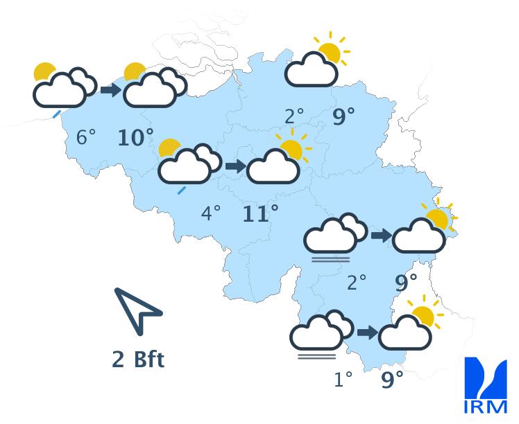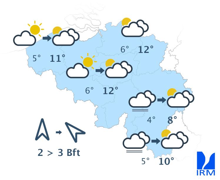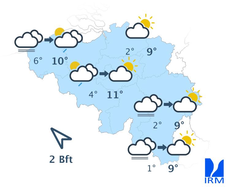 Ce soir et une partie de la nuit, quelques averses pourront encore traîner puis le temps redeviendra sec sur l'ensemble du pays. De larges éclaircies se développeront en Basse et Moyenne Belgique. Des nuages bas et du brouillard sont par contre prévus au sud du sillon Sambre et Meuse. Les minima varieront entre 4 et 7 degrés avec un vent faible à modéré de sud à sud-sud-ouest.