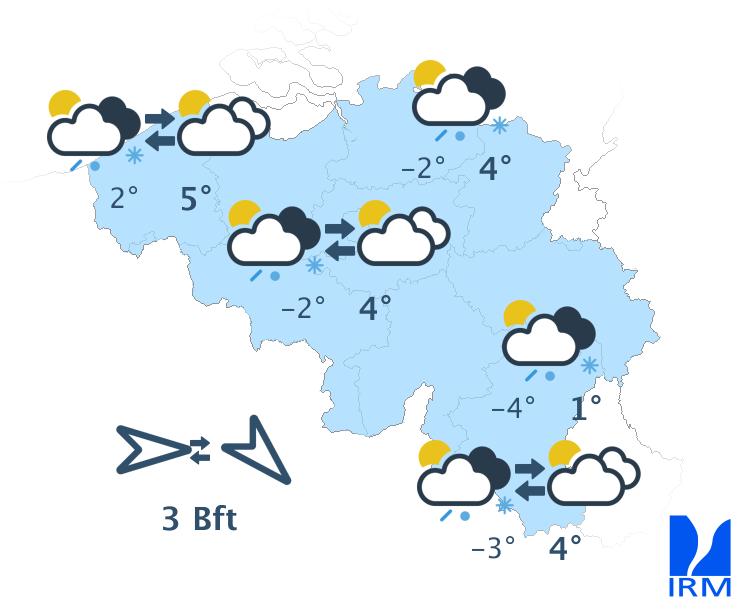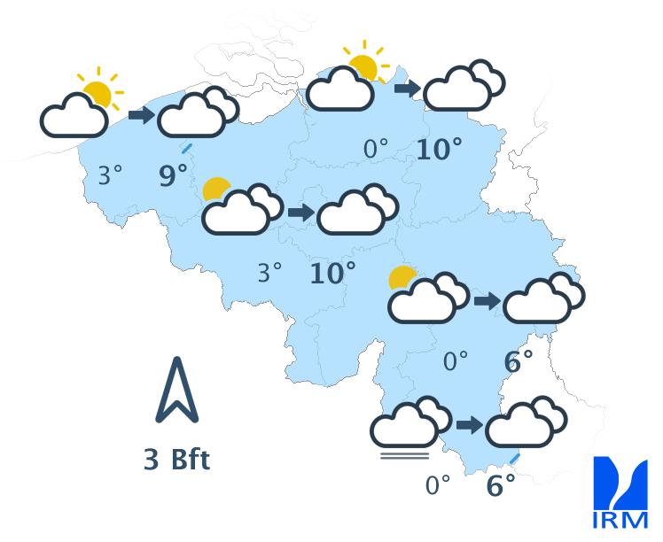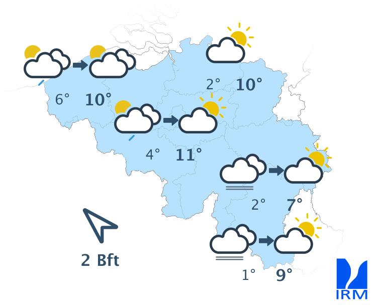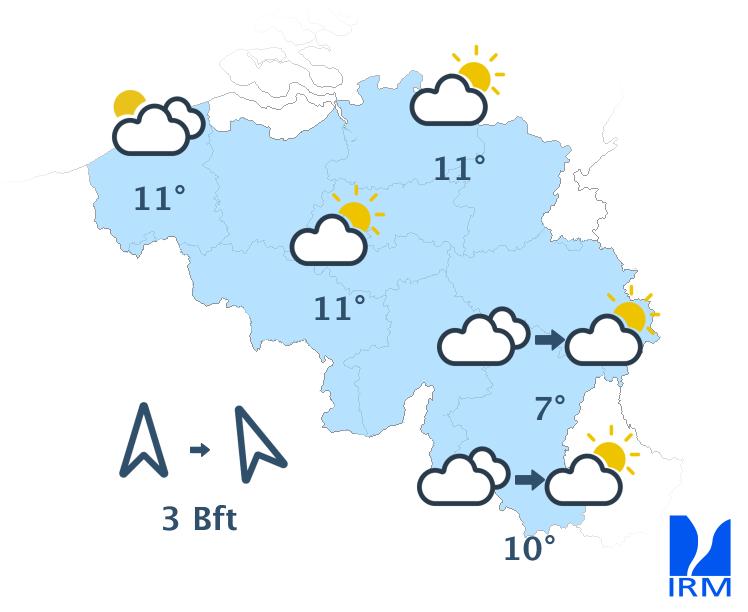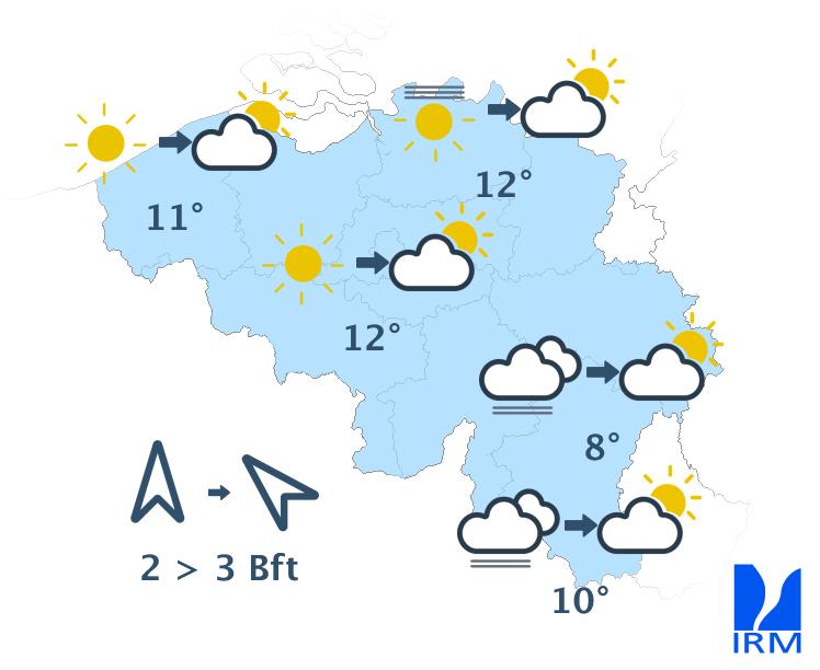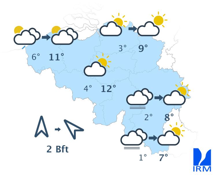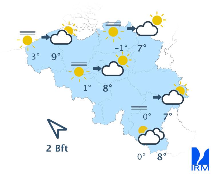 Ce matin, le temps sera ensoleillé excepté au sud du sillon Sambre et Meuse où des nuages bas et du brouillard persisteront. L'après-midi, le ciel deviendra partout partiellement nuageux mais le temps restera généralement sec. Les maxima varieront entre 7 degrés en Hautes Fagnes et 11 à 12 degrés en plaine. Le vent sera faible à modéré de sud revenant au sud-est.