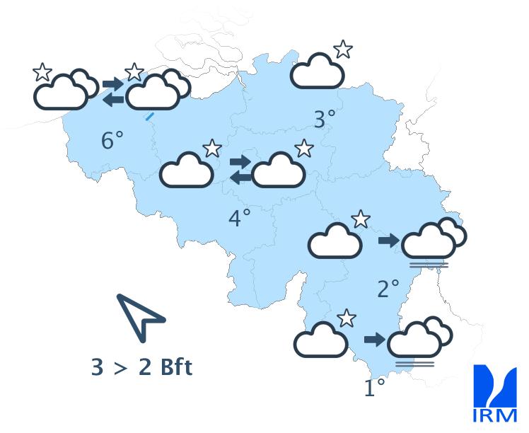 Ce soir et cette nuit, nous aurons d'abord de larges éclaircies et un risque de brouillard, surtout en Ardenne et en Lorraine Belge. En cours de nuit, la nébulosité augmentera sur l'ouest avec éventuellement une averse isolée. Les minima oscilleront entre -1 degré en Hautes Fagnes et +6 degrés dans l'extrême ouest sous un vent faible à parfois modéré de secteur sud-est.