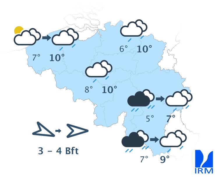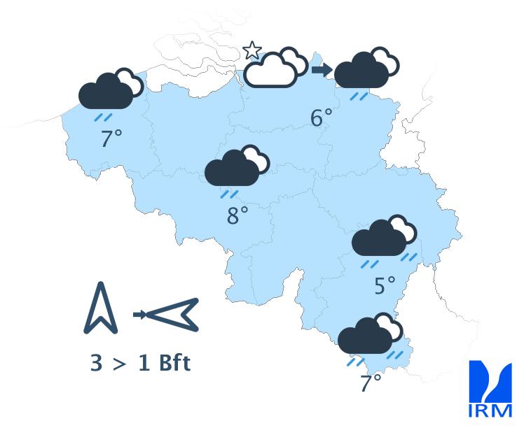 Cette nuit, plusieurs zones de précipitations traverseront notre pays depuis la France. Dans le sud du pays, la pluie sera plutôt continue et donnera lieu à d'abondants cumuls par endroits. Ailleurs, il s'agira de périodes de pluie parfois modérée. Les minima seront compris entre 5 degrés en Ardenne et 7 à 8 degrés ailleurs. Suite au passage d'un noyau de basse pression, le vent modéré de sud à sud-est s'orientera au nord à nord-ouest sur la partie nord-ouest du territoire en cours de nuit, et dans le sud-est du pays au secteur sud-ouest. Dans le centre, le vent deviendra temporairement faible et variable.