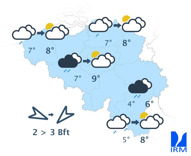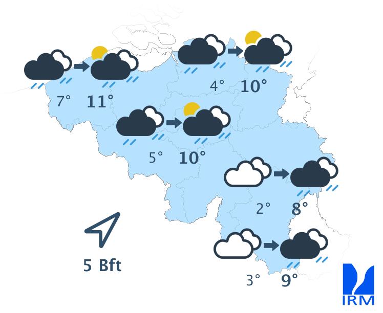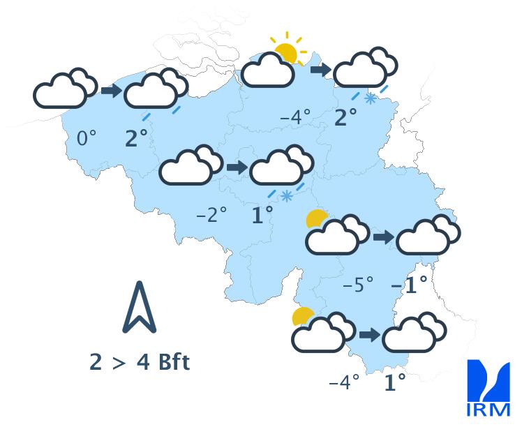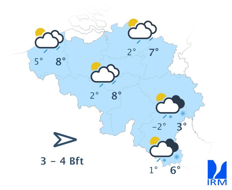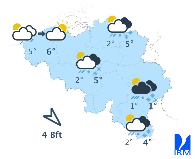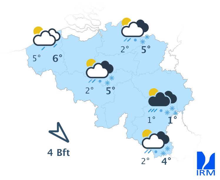 Mardi, sous une nébulosité d'abord abondante, puis plus variable, les précipitations se maintiendront sous la forme d'un train d'averses assez fréquentes en provenance de la mer du Nord. Celles-ci adopteront toujours un caractère hivernal, surtout en Haute Belgique. Les maxima s'échelonneront entre 0 et 2 degrés en Ardenne et autour de 5 à 7 degrés sur le centre du pays. Le vent de nord-ouest sera modéré à assez fort dans les terres et fort à la mer.