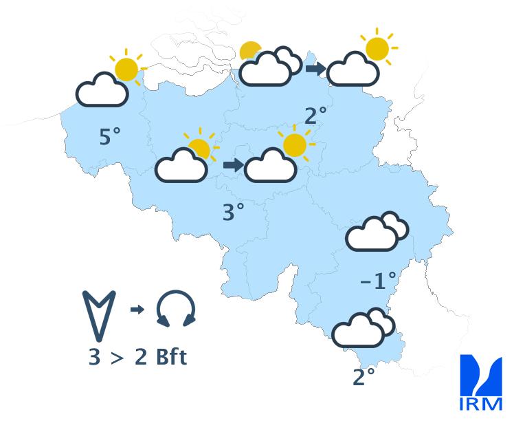 Samedi soir, le ciel sera peu nuageux, avec encore dans un premier temps davantage de nuages dans le sud-est du pays. Durant la nuit de samedi à dimanche, la nébulosité augmentera à partir de l’ouest, mais le temps restera sec. Dans l'est, le ciel demeurera longtemps peu nuageux avec des voiles d’altitude. La nuit sera froide avec des minima de –1 degré au littoral à –6 degrés en Hautes Fagnes. Le vent sera d’abord faible de secteur nord ou variable, puis deviendra modéré de secteur sud.