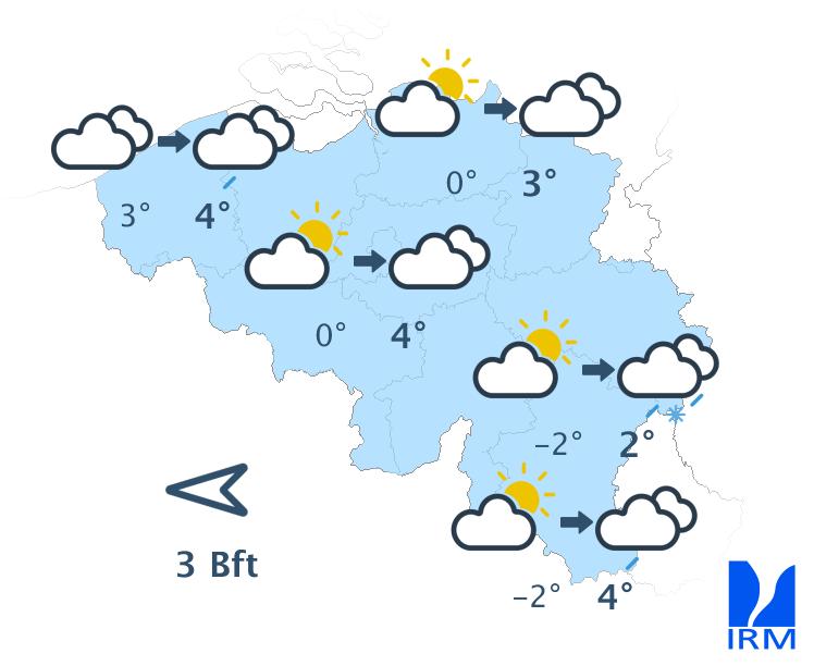 En mi-journée, nous prévoyons temporairement encore des éclaircies sur la moitié est du pays mais le ciel deviendra rapidement plus nuageux. Une perturbation atteindra la côte cet après-midi et sera à l'origine de chutes de neige (fondante); elle poursuivra ensuite sa lente progression à travers notre territoire pour concerner l'est de celui-ci vers la fin de la journée. La neige pourrait temporairement tenir au sol et donner lieu à des conditions glissantes. Les températures ne dépasseront pas la barre des 0°C sur les hauteurs de l'Ardenne et se situeront entre 2 et 4°C ailleurs, sous un vent de sud modéré à parfois assez fort avec des rafales jusqu'à 50 ou 60 km/h.