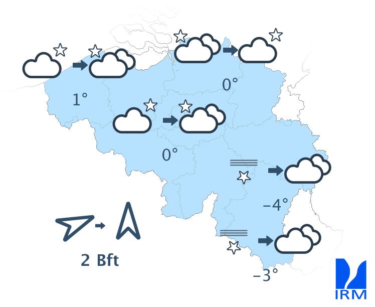Ce soir, quelques averses, ou quelques flocons de neige en Hautes-Fagnes, seront encore possibles. Au cours de la nuit, le temps deviendra plus sec, mais il faudra, par endroits, se méfier d'un risque de formation de plaques de glace. Les minima oscilleront entre -4 degrés dans certaines vallées ardennaises et +1 degré sur l'extrême ouest. Le vent deviendra faible de direction variable avant de s'orienter à l'est/sud-est en fin de nuit.