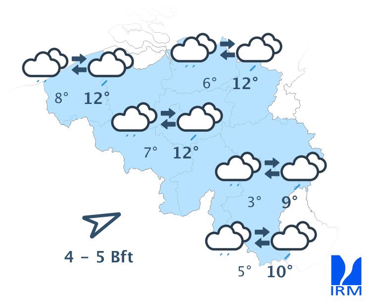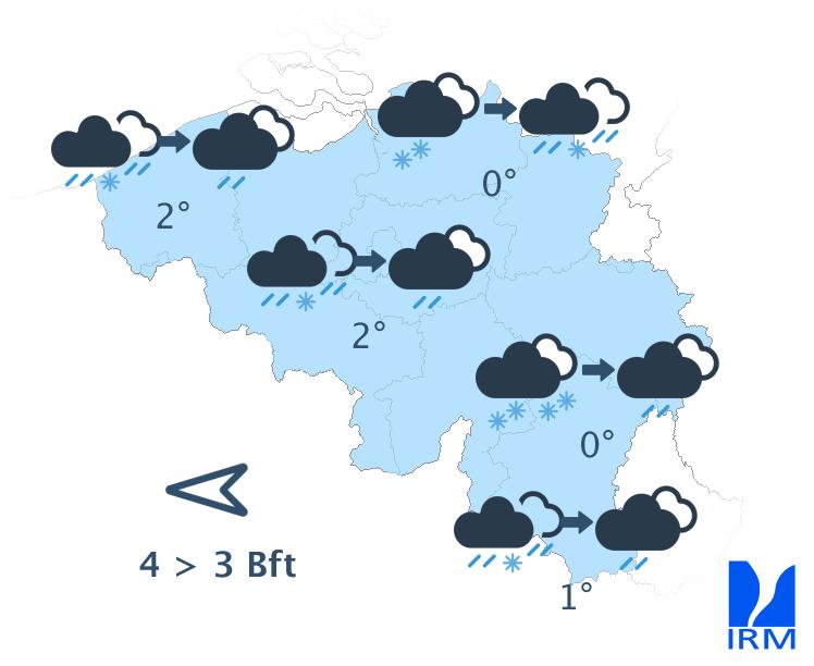 En soirée, le temps deviendra très nuageux suite au passage d'une perturbation provenant de la France. En Basse et en Moyenne Belgique, elle donnera de la pluie, éventuellement précédée de précipitations hivernales. En Haute Belgique, il s'agira essentiellement de neige. Les minima se situeront entre -1 et +3 degrés sous un vent modéré à parfois assez fort d'est à sud-est.