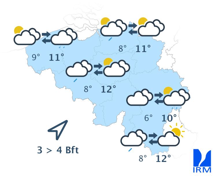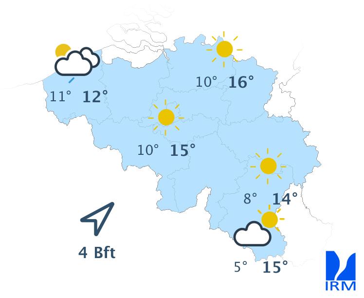 Les maxima se situeront entre 11 degrés sur les hauteurs ardennaises et 14 degrés en Basse-Belgique. Le vent sera généralement modéré et s’orientera du sud-ouest vers le sud ou le sud-sud-est.