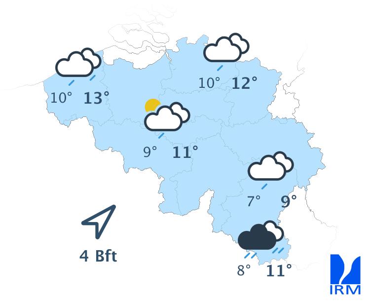 Cette après-midi, le temps sera d’abord très nuageux et pluvieux. Au fil des heures, des conditions plus sèches gagneront l’ouest et le nord-ouest du territoire où quelques éclaircies deviendront d’ailleurs possibles en fin de journée. Les maxima varieront entre 8 à 9 degrés en Ardenne et 11 à 12 degrés en plaine. Le vent sera modéré dans les terres, assez fort à fort à la mer, de sud-ouest. Les rafales atteindront 50 km/h, localement 60 km/h au littoral.