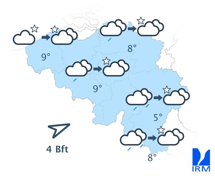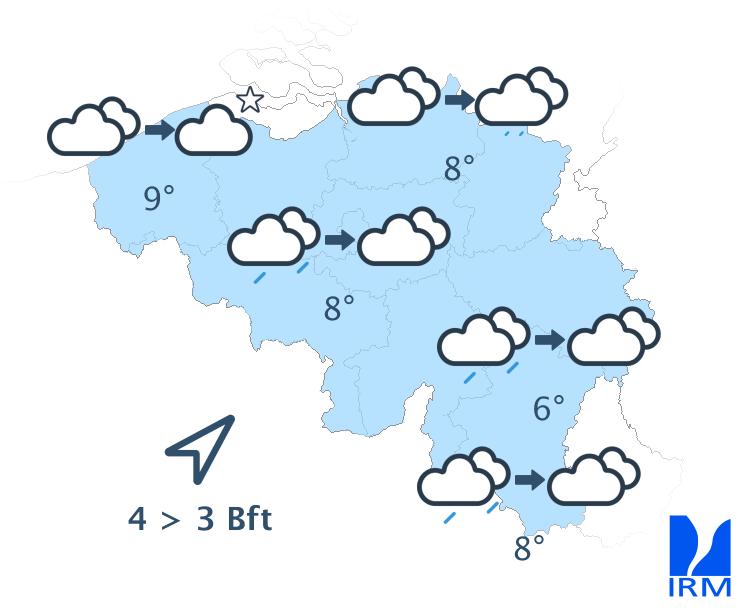 Ce soir, la zone de pluie se décalera vers l’est et s’attardera encore au sud du sillon Sambre-et-Meuse tandis que des conditions plus sèches gagneront la Basse et la Moyenne Belgique avec quelques éclaircies. En seconde partie de nuit, le temps sec s’établira finalement sur toutes les régions, mais il faudra composer avec de nombreux nuages bas, parfois entrecoupés de quelques éclaircies. Les minima oscilleront entre 4 à 6 degrés sur les hauteurs et seront proches de 8 ou 9 degrés en plaine. Le vent restera modéré dans les terres, assez fort à la mer, de sud-ouest.