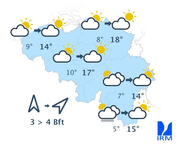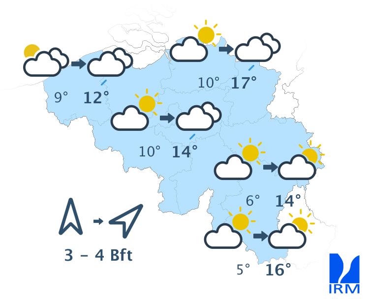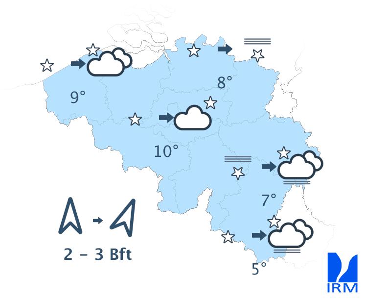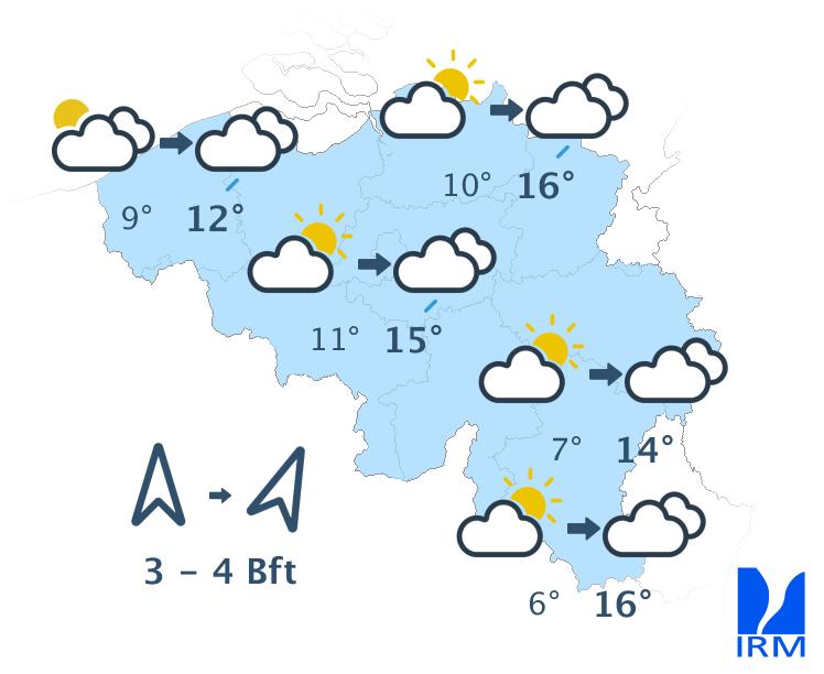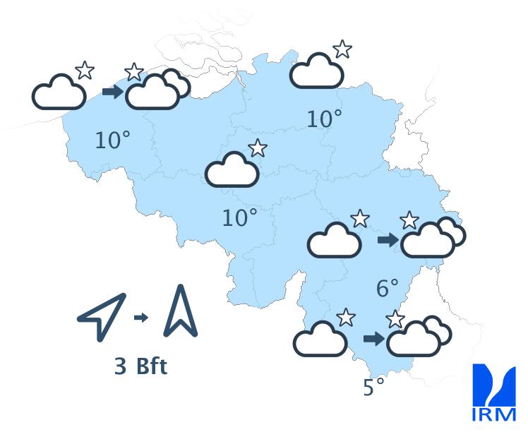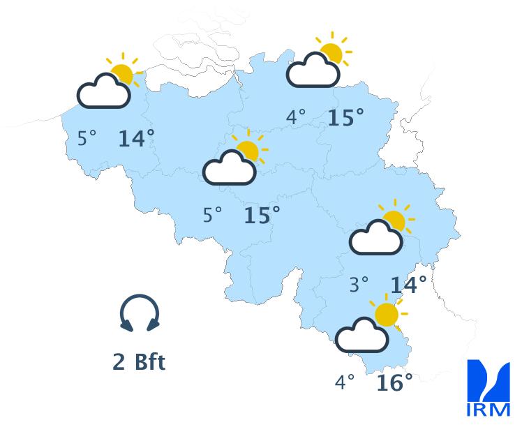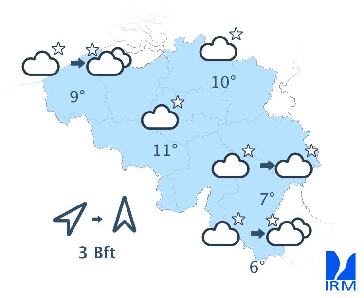 Ce soir, le temps sera souvent peu nuageux avec des nuages élevés. En fin de nuit, il y aura davantage de nuages sur l'ouest et le nord-ouest. Des nuages bas pourront également se former sur le flanc sud de l'Ardenne et en Lorraine belge. Les minima seront compris entre 5 ou 6 degrés en Haute Belgique et 9 à 11 degrés en Basse et en Moyenne Belgique. Le vent modéré de sud-ouest s'orientera au secteur sud.