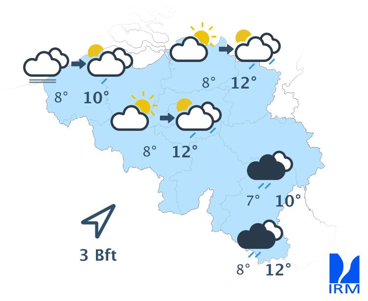 Vendredi, il y aura d'abord du soleil, excepté sur l'ouest et le nord-ouest du pays. Au fil des heures, les champs nuageux se répandront vers le centre alors qu'une zone de pluie atteindra le pays depuis le littoral et se déplacera lentement vers l'intérieur. Au sud du sillon Sambre-et-Meuse, le temps restera probablement sec avec de larges éclaircies. Les maxima seront voisins de 11 à 12 degrés à la mer, 13 ou 14 degrés en Ardenne et 16 degrés en Campine ou en Lorraine belge. Le vent modéré de sud s'orientera au sud-ouest. A la mer, il sera parfois assez fort. Quelques rafales de 50 km/h seront également possibles.