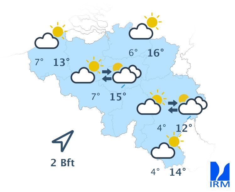 Mardi, des champs nuageux alterneront avec des périodes ensoleillées parfois très généreuses. Sous les passages nuageux, quelques gouttes de pluie ne sont pas exclues, mais en quantité limitée. Les maxima s'échelonneront entre 12 et 14 degrés sous un vent de sud assez faible.