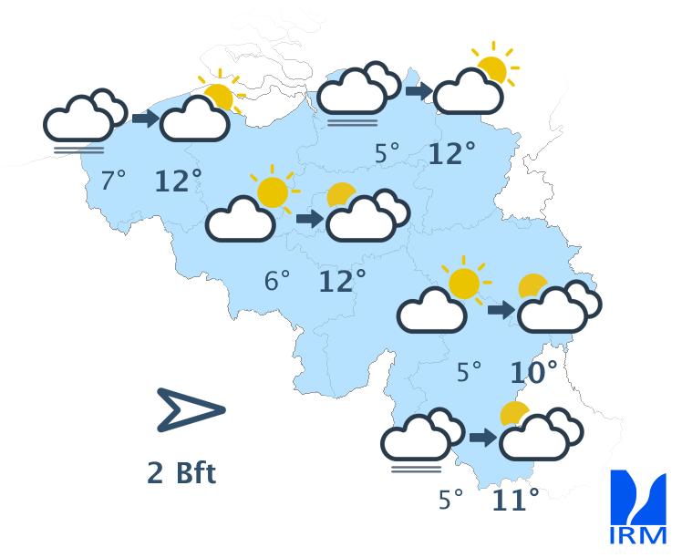 Dimanche, la journée débutera avec des nuages bas en Haute Belgique, mais avec de larges éclaircies ailleurs. Au fil des heures, la nébulosité augmentera sur un tiers nord-ouest du pays avec la possibilité de quelques gouttes de pluie, principalement sur la région côtière. Sur les autres régions, des éclaircies alterneront avec des nuages cumuliformes. Les températures n'évolueront pas avec des valeurs de 7 à 8 degrés en Ardenne, 12 degrés sur le centre et 13 degrés en Campine.