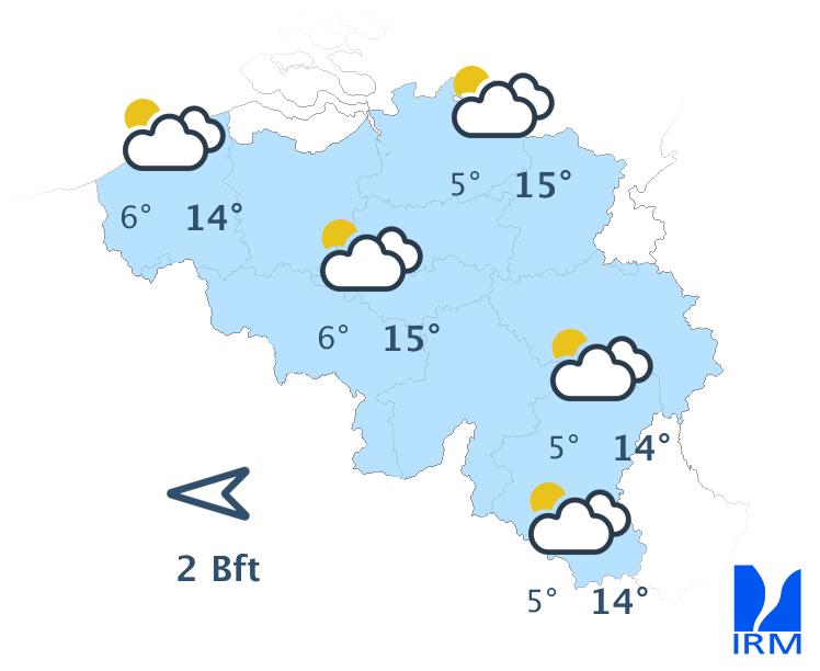 Demain, les larges éclaircies céderont la place à davantage de champs nuageux par l'ouest. L'après-midi, quelques faibles pluies ou bruines pourront d'ailleurs se produire, surtout sur le nord-ouest du territoire. En Ardenne, la nébulosité devrait rester plus variable. Les maxima seront compris entre 9 degrés en Hautes-Fagnes et 13 degrés en Campine, sous un vent modéré de sud à sud-ouest.