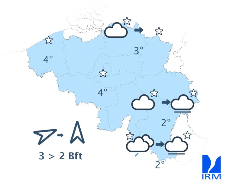 Ce soir, alors que les dernières averses s'évacueront vers l'est, de larges éclaircies se développeront par l'ouest. Cette nuit, le ciel sera serein à peu nuageux, même si quelques champs de nuages bas ou bancs de brouillard ne seront pas exclus dans le sud-est. Les minima varieront le plus souvent entre 0 et +4 degrés. Dans certaines vallées ardennaises, de faibles gelées pourront toutefois se produire. Le vent reviendra au secteur sud et deviendra faible à modéré.