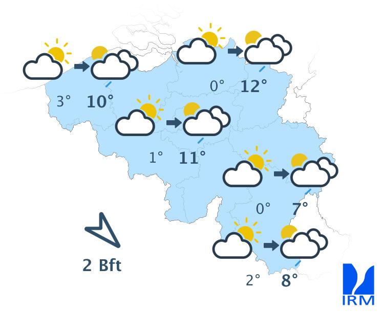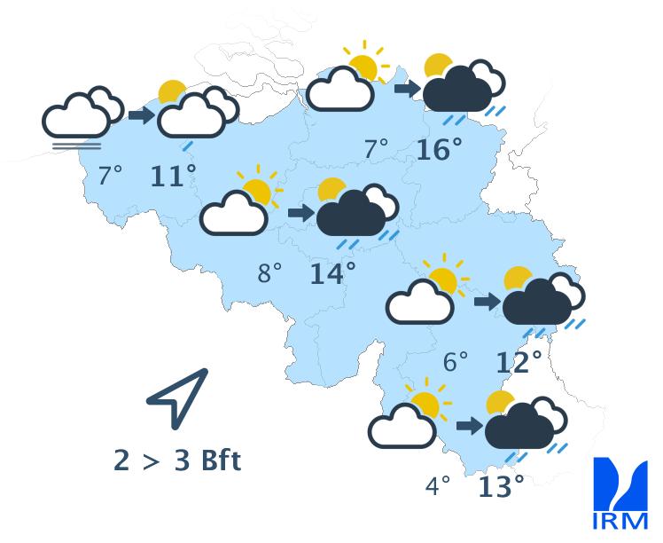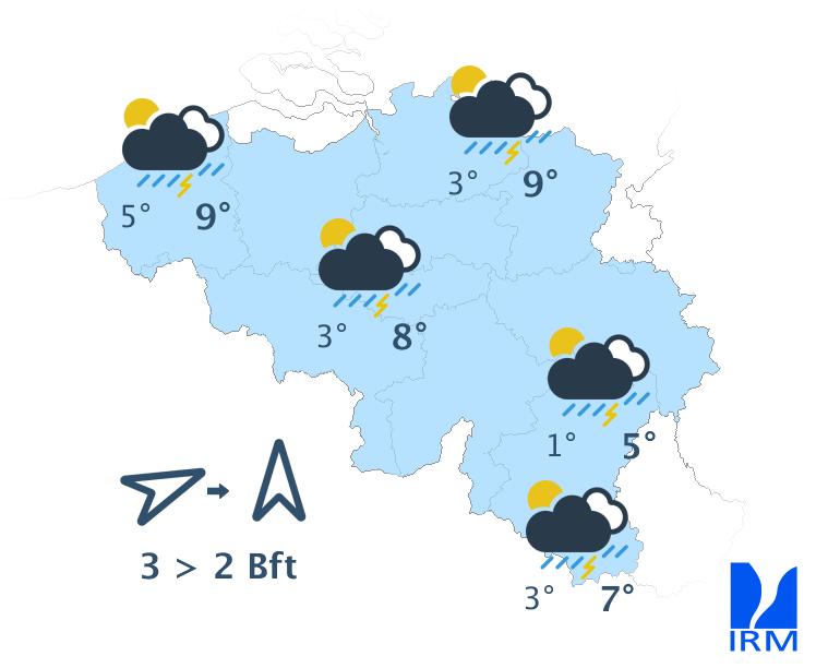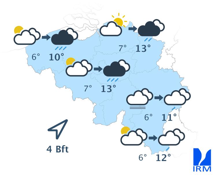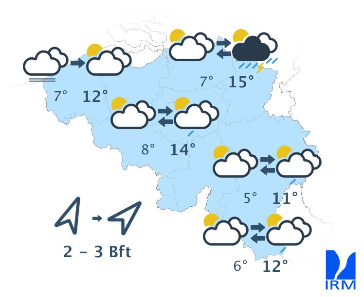 Demain matin, la journée débutera avec du brouillard dans l'extrême nord-ouest. Ailleurs, le ciel sera plutôt nuageux avec quelques averses. L'après-midi, la nébulosité deviendra plus variable mais les averses pourront s'intensifier, voire adopter un caractère orageux du centre à l'est. Les maxima s'échelonneront de 10 degrés en Hautes-Fagnes à 15 degrés en Campine, sous un vent faible à modéré de secteur sud-ouest.