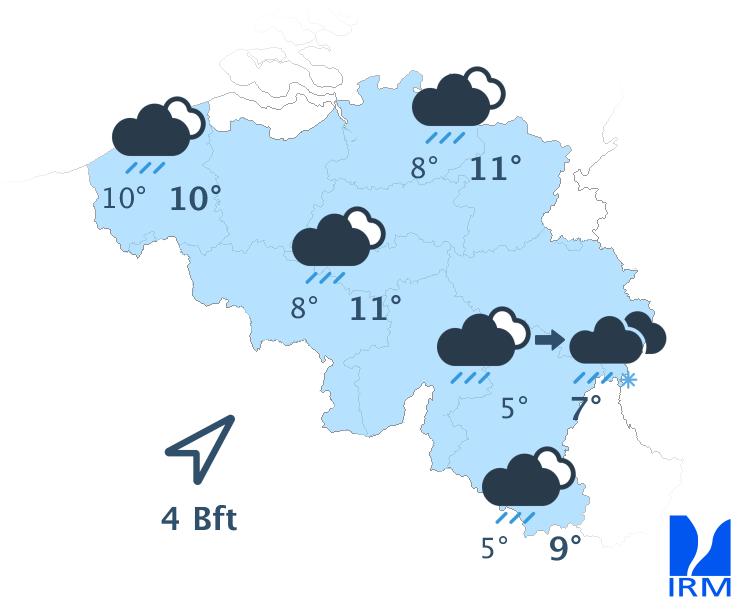 Vendredi, la nébulosité sera abondante avec de la pluie. Par endroits, les quantités de précipitations pourront être assez importantes. Ensuite, le temps deviendra plus sec à partir du littoral avec de larges éclaircies. La perturbation pourra toutefois encore traîner sur l'Ardenne jusqu'en soirée ou durant la nuit. La pluie pourrait alors se transformer en neige (fondante). Les maxima varieront de 6 à 11 degrés. Le vent sera modéré à assez fort de sud, virant à l'ouest-sud-ouest tout en devenant modéré. Les rafales pourront atteindre des valeurs de 60 à 70 km/h.