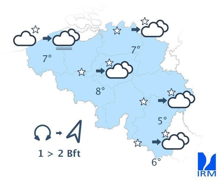 En première partie de nuit, le risque de l'une ou l'autre averse (éventuellement ponctuée d'un coup de tonnerre) persistera encore quelques heures, notamment en Ardenne. Le ciel sera peu nuageux à serein dans la plupart des régions. Plus tard dans la nuit, du brouillard pourra à nouveau se former dans le nord-ouest du pays. En fin de nuit, la nébulosité et le risque d'averses augmenteront par le sud-ouest. Les minima seront compris entre 2 et 7 degrés en Ardenne et entre 6 et 8 degrés ailleurs, sous un vent faible et variable ou de sud à sud-ouest.