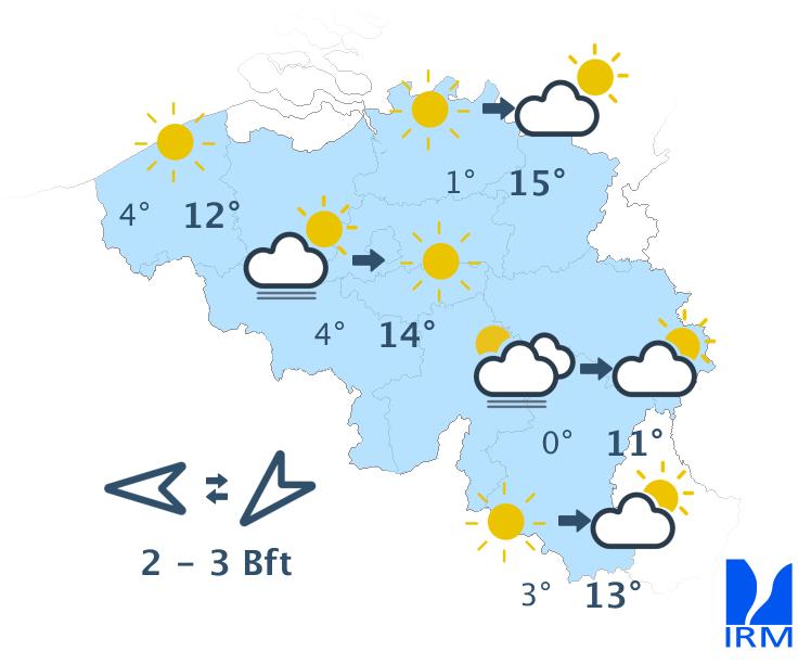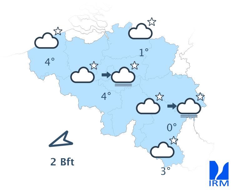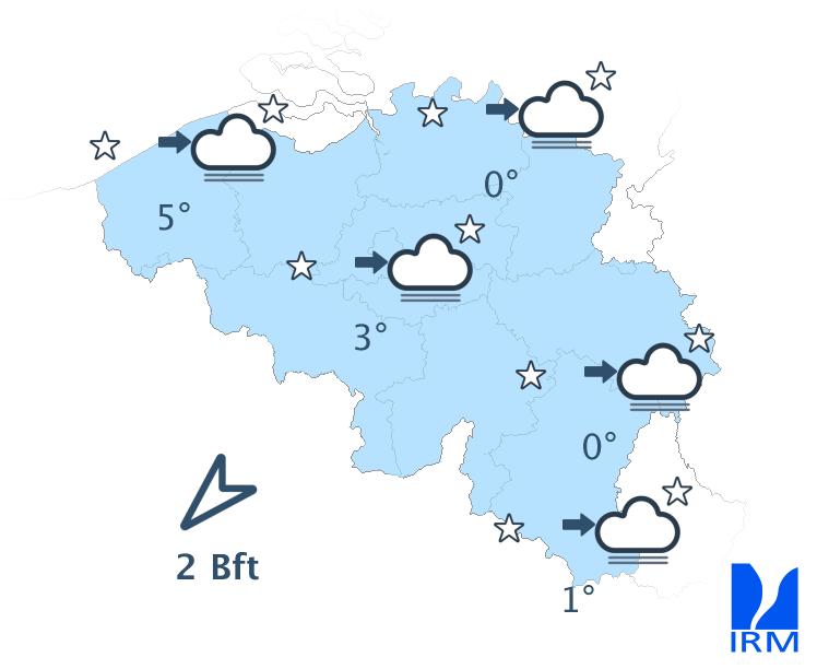 En première partie de nuit, le ciel sera peu à partiellement nuageux avec essentiellement des nuages élevés. En cours de nuit, de larges éclaircies se développeront et de la brume ou des bancs de brouillard localisés se formeront dans certaines régions. Des champs de nuages bas un peu plus nombreux dériveront depuis les Pays-Bas en fin de nuit. Les températures minimales seront comprises entre -2 degrés en Ardenne (mais localement jusqu'à -5 degrés dans certaines vallées) et 5 degrés à la mer. Le vent deviendra faible de nord-est ou de direction variable.