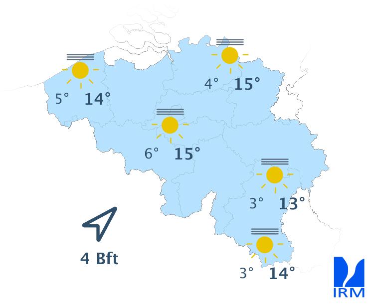 Dimanche, le temps sera généralement ensoleillé avec, plus tard dans la journée, parfois quelques champs nuageux. Les maxima se situeront entre 10 et 15°C, sous un vent faible à modéré d'est à nord-est et, l'après-midi, une brise de mer modérée de nord-nord-est au littoral.