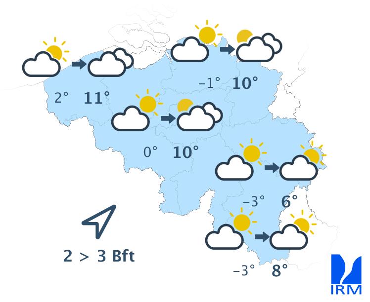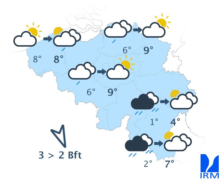 Jeudi soir, le ciel restera variable avec quelques giboulées et averses hivernales, mais la nuit le temps deviendra progressivement plus sec avec des éclaircies plus généreuses. Du brouillard givrant pourra alors se former en Haute Belgique. Les minima avoisineront -4 degrés dans les Hautes Fagnes, 0 degré en plaine et +2 degrés au bord de la mer. Le vent modéré de nord-ouest à nord faiblira et reviendra au sud à sud-ouest dans la plupart des régions.