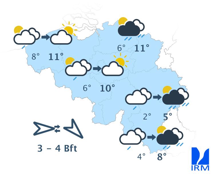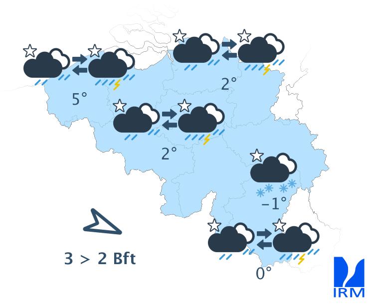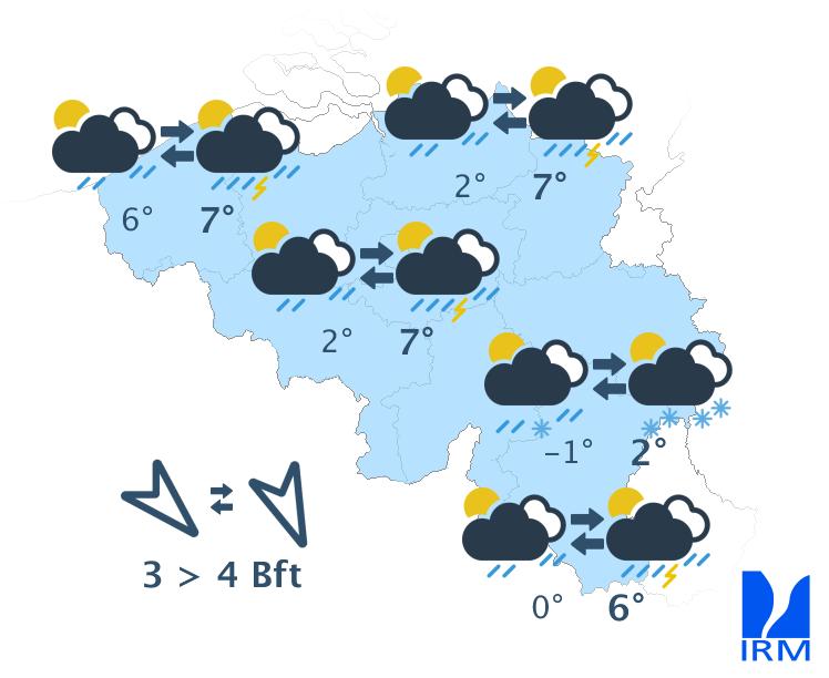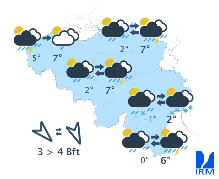 Demain, des éclaircies alterneront avec de nombreuses averses, qui pourront s'accompagner de grésil, d'orages et de rafales de vent pouvant atteindre environ 65 km/h. Dans les Ardennes, les précipitations pourront se présenter sous forme de neige fondante et de neige. Les températures maximales oscilleront entre 2 degrés sur les hauteurs ardennaises et 8 degrés dans de nombreuses localités de Flandre. Le vent sera généralement modéré, parfois assez fort en bord de mer, de nord-ouest à nord-nord-ouest.