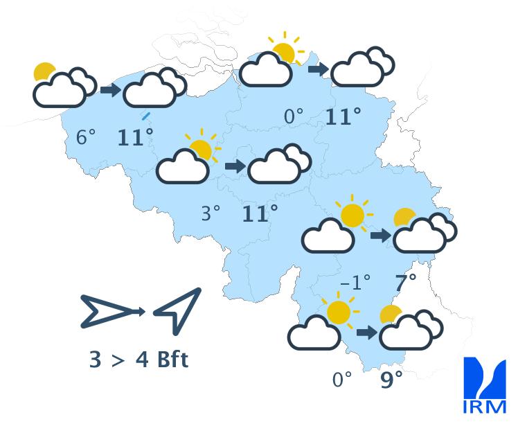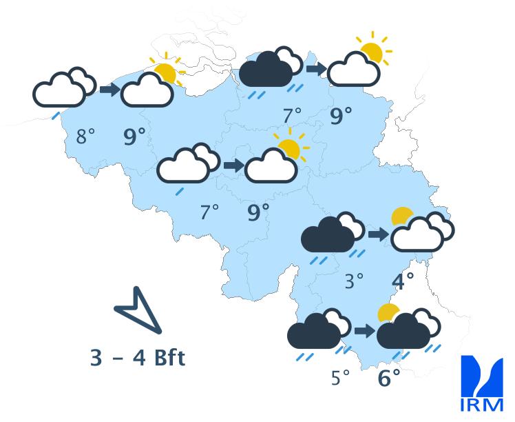 Cet après-midi, le ciel sera variable à parfois très nuageux, avec des averses et des giboulées qui traverseront le pays en provenance du nord-ouest, avec un risque de grésil et d'orage. Dans les Ardennes, il pourra tomber de la neige fondante, qui se transformera en neige en fin d'après-midi et ce soir, avec un risque d'accumulation. Les températures maximales seront comprises entre 3 degrés dans les Ardennes et 8 à 9 degrés en Flandre. Le vent sera généralement modéré de nord-ouest. Dans l'ouest, il sera modéré à assez fort, et fort en bord de mer. Des rafales autour de 50 km/h sont prévues, mais lors d'une averse intense, elles pourront atteindre environ 75 km/h, voire même 90 km/h à la mer.