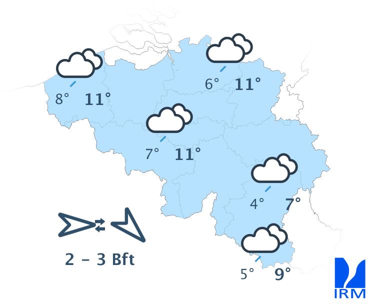 Lundi, la nébulosité sera variable avec quelques averses, éventuellement hivernales en haute Ardenne. Les maxima varieront entre 5 degrés en haute Ardenne et 11 degrés en Flandre. Le vent d'ouest à nord-ouest sera assez soutenu.
