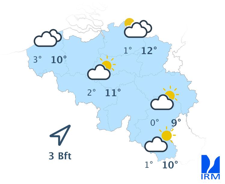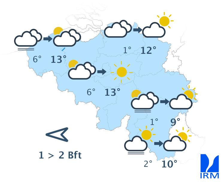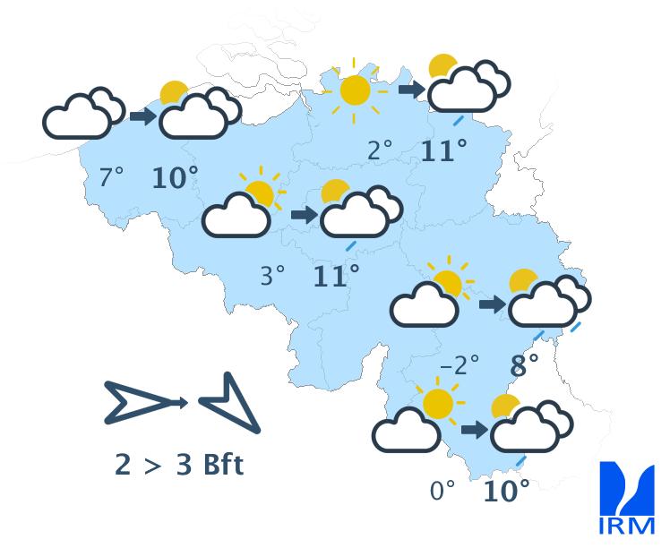 Durant la nuit, ces éclaircies s’étendront à la moitié sud-est du territoire tandis que le ciel restera nettement plus nuageux sur la moitié nord-ouest. En fin de nuit, il faudra enfin se méfier de la formation de brouillard (givrant) sur les régions où le ciel se sera dégagé. Les minima seront compris entre -1 et +2 degrés sur l’est, 5 à 7 degrés sur le centre et l'ouest. Le vent deviendra faible de direction variable.