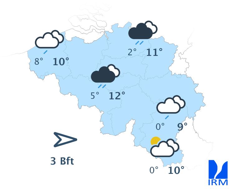 Jeudi, le ciel sera très nuageux avec une faible perturbation qui progressera graduellement sur le pays de l'ouest en direction de l'est avec parfois quelques faibles pluies ou bruines. Dans l'après-midi, le temps deviendra sec dans l'ouest et ensuite aussi sur le centre et on peut espérer l'une ou l'autre éclaircie. Les maxima varieront entre 6 et 11 degrés avec un vent modéré qui tournera du secteur sud-ouest au nord-ouest après le passage de la perturbation.
