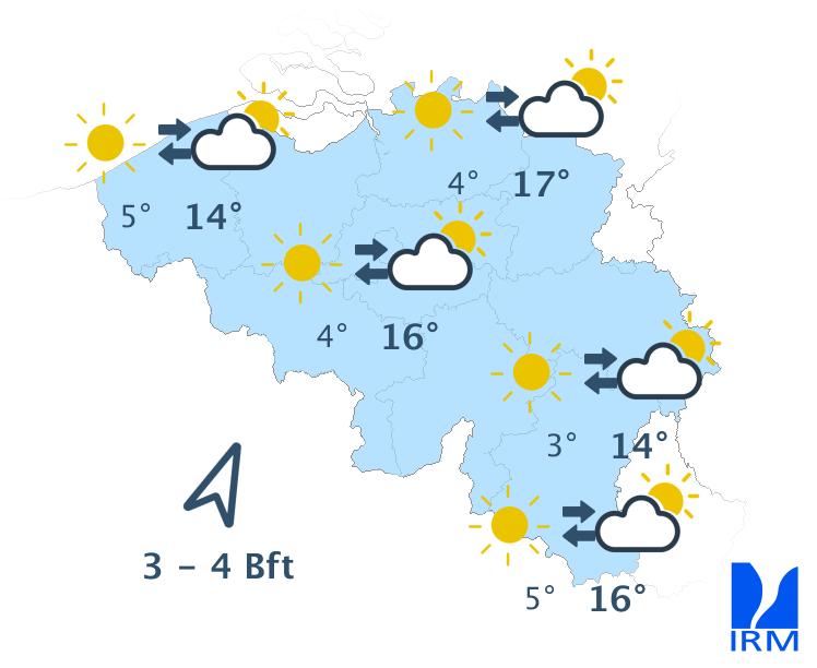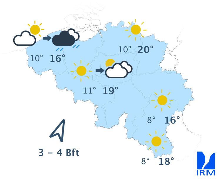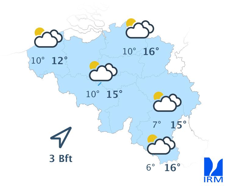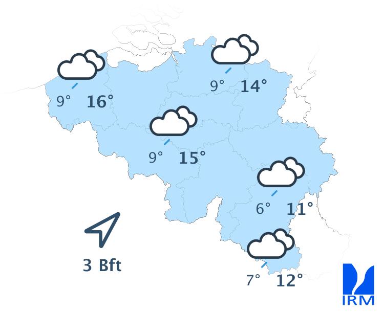Mardi, le temps sera d'abord ensoleillé, ensuite la nébulosité augmentera depuis l'ouest et sera suivie par de la pluie. Les maxima seront doux et compris entre 15 et 20 degrés.