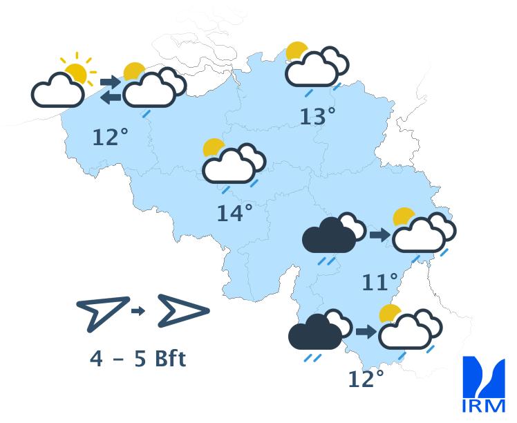 Aujourd'hui, le ciel sera d'abord généralement très nuageux avec quelques faibles pluies ou bruines par intermittence. L'après-midi, les nuages laisseront progressivement filtrer des éclaircies à partir de la côte, mais pourront donner lieu à quelques ondée ou averses locales. En fin d'après-midi, les éclaircies pourront s'élargir. Il fera plus frais que la veille avec des maxima de 10 à 12 degrés sur les hauteurs de l'Ardenne, et entre 11 et 14 degrés ailleurs. Le vent s'orientera au secteur ouest à sud-ouest partout; il sera modéré à parfois assez fort dans les terres et assez fort à parfois fort au littoral, avec des rafales autour de 50 ou 60 km/h dans l'intérieur du pays et de 65 à 75 km/h en bord de mer.