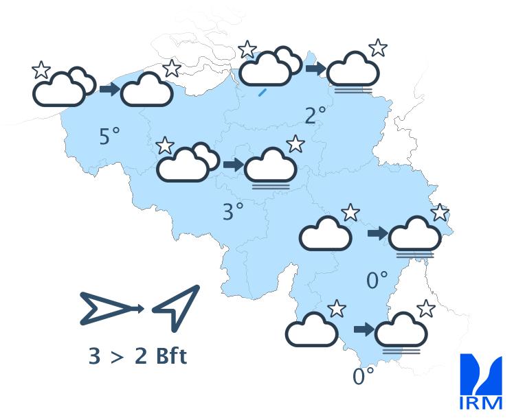Après quelques dernières ondées locales en début de soirée, le temps deviendra sec et plus calme. Le ciel se dégagera partout et les températures chuteront alors sensiblement pour atteindre des minima de -2 ou -3 degrés dans certaines vallées de l'Ardenne à +4 ou +5 degrés en bord de mer, et généralement compris entre +1 et +3 degrés dans le centre du pays. De faibles gelées au sol seront dès lors possibles et des bancs de brouillard pourront se formeront par endroits. Le vent deviendra progressivement faible et reviendra au secteur sud-ouest; à la côte, il restera modéré de secteur ouest à nord-ouest durant une bonne partie de la nuit.