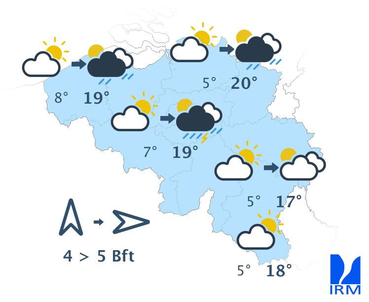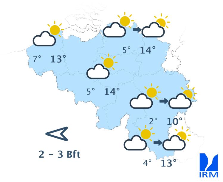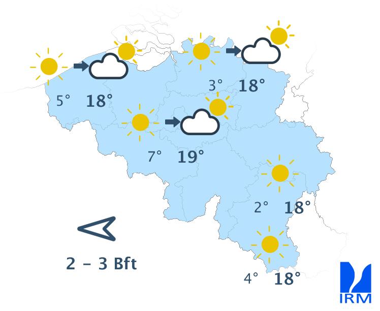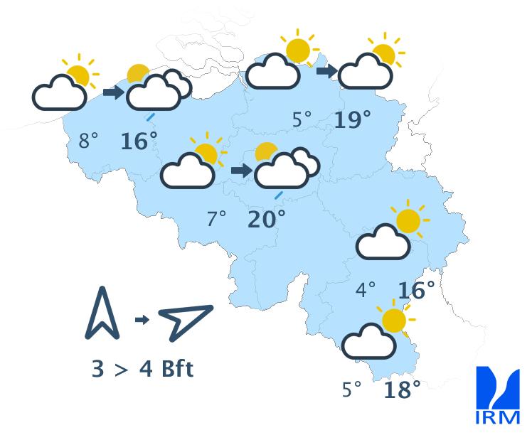 Mercredi sera une belle journée printanière douce et bien ensoleillée avec des maxima de 16 degrés en haute Ardenne à 20 ou 21 degrés en Flandre et dans le centre du pays. Le vent d'est sera faible à parfois modéré la journée. L'après-midi, une brise de mer de nord-est pourrait ramener de l'air un peu plus frais dans la région littorale.