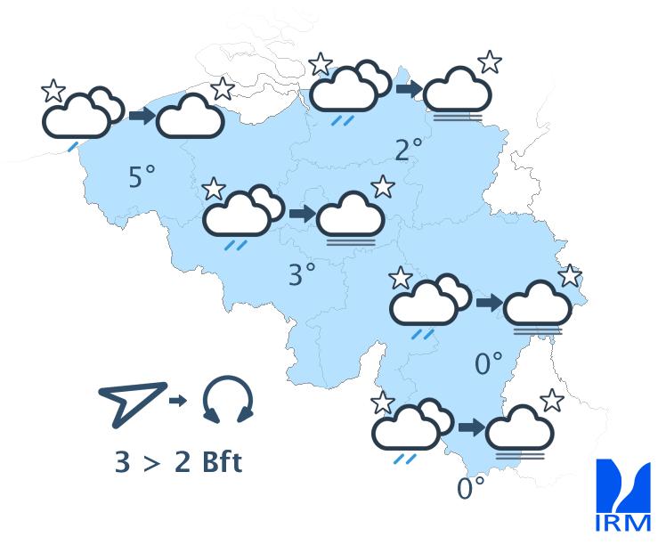 Durant la nuit de mardi à mercredi, le ciel restera dégagé avec des minima de 0 ou -1°C dans certaines vallées de l'Ardenne à 6 ou 7°C au cœurs des grands centres urbains. Le vent sera faible à parfois modéré de secteur est à est-sud-est.