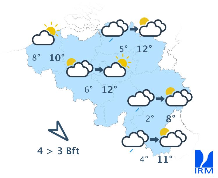 Cette nuit, le ciel sera peu nuageux à serein avec des minima de -2 ou -3°C dans certaines vallées de l'Ardenne à +5 ou +6°C au cœur des grands centres urbains. Le vent sera faible à parfois modéré et s'orientera au secteur est. Un peu de brume pourrait se former le long de certains cours d'eau encaissés.