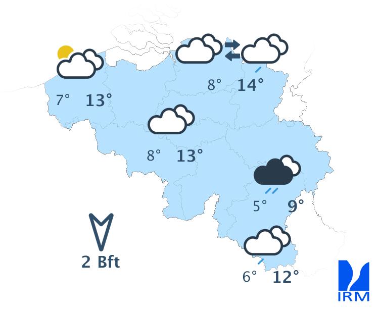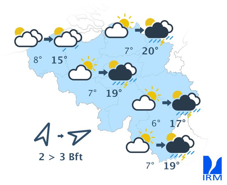 Aujourd'hui, la journée débutera par des éclaircies et des champs nuageux d'altitude. Ces éclaircies pourront même temporairement être assez larges ce matin. Par après, la nébulosité augmentera à partir de l'ouest et de la France, puis une perturbation accompagnée de pluie ou d'averses atteindra l'ouest du pays en milieu de journée. Elle s'étendra ensuite au reste du pays en cours d'après-midi. Quelques coups de tonnerre ne sont pas exclus. Il fera à nouveau beaucoup plus doux avec des températures maximales de 15 degrés le long du littoral, 19 ou 20 degrés dans le centre du pays à 21 ou même localement 22 degrés en Campine. Le vent modéré de sud-est s'orientera au sud-ouest, puis à l'ouest au cours de la journée. Il deviendra assez fort le long du littoral. Pendant les averses, des rafales pouvant atteindre 60 km/h, voire légèrement supérieures, seront possibles.