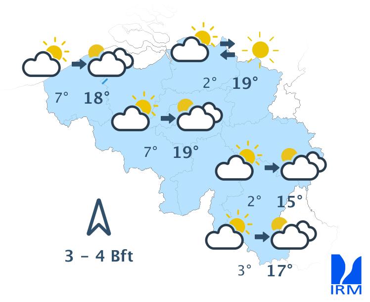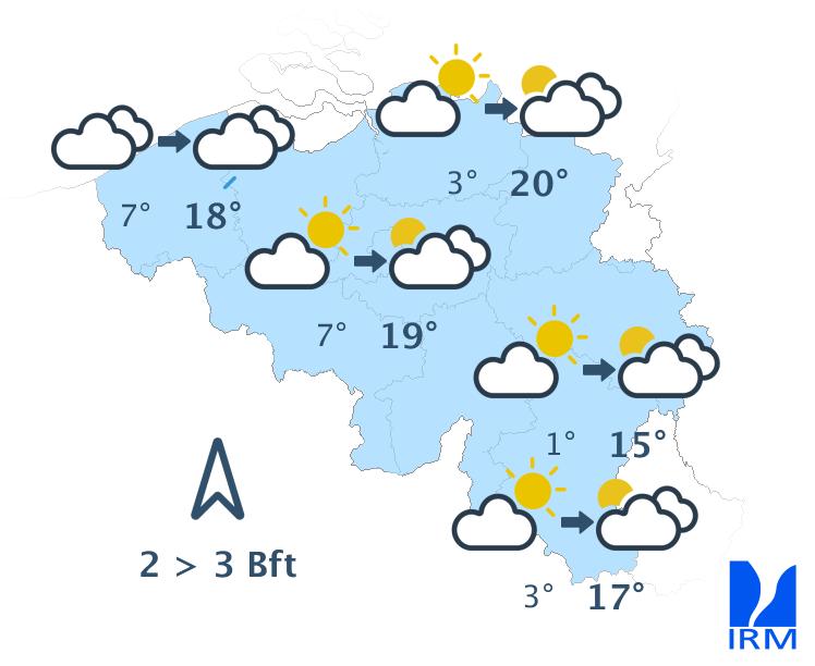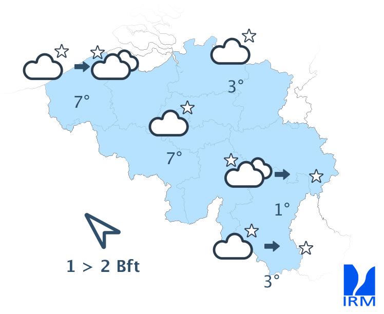 Cette nuit, le temps sera sec et le ciel peu nuageux à serein. Dans les vallées au sud du sillon Sambre et Meuse, des bancs de brouillard seront possibles. Plus tard dans la nuit, davantage de champs nuageux arriveront par l'ouest. Les minima se situeront entre 0 et +7 degrés. Dans certaines vallées ardennaises, de faibles gelées seront possibles par endroits. Le vent sera faible à localement modéré de sud-est ou de direction variable.