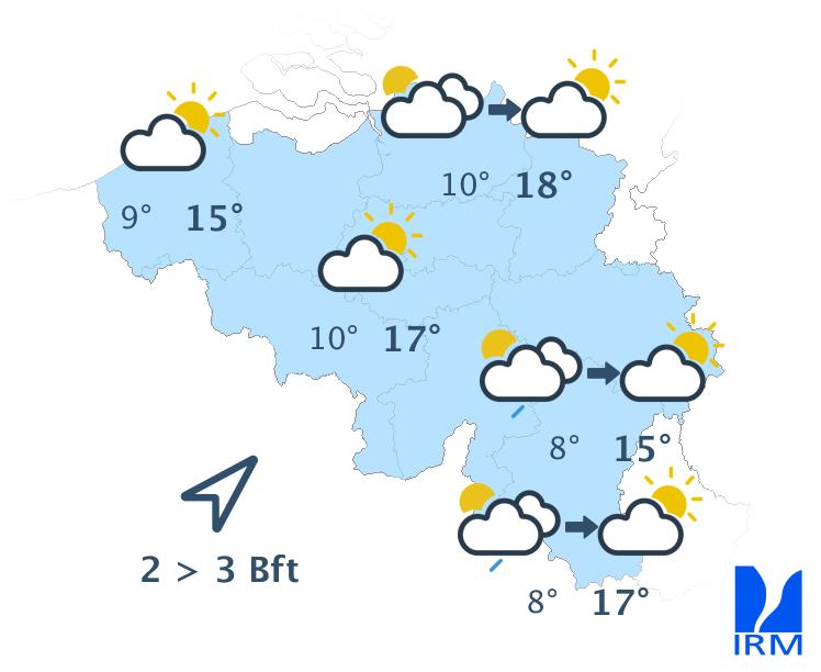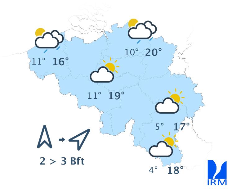 Jeudi, des éclaircies alterneront avec des passages nuageux. Une averse locale est possible, surtout dans la moitié sud du pays. Les températures maximales oscilleront entre 15 degrés à la mer et 18 degrés en Campine. Le vent sera faible puis modéré, soufflant du sud-ouest. A la côté, le vent sera modéré à parfois assez fort de sud-ouest tournant vers l'ouest.