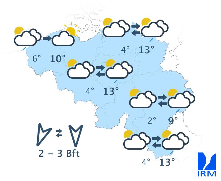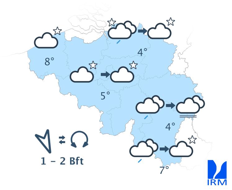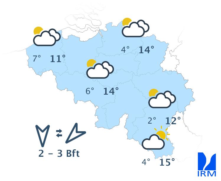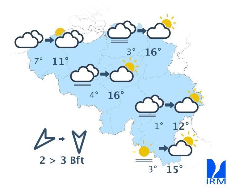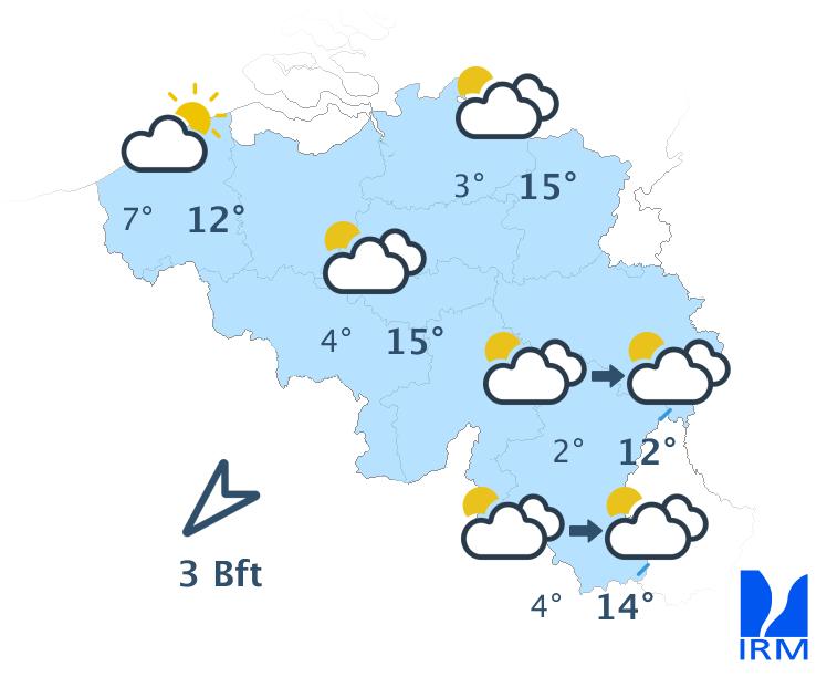 En début de nuit de larges éclaircies pourront être encore présentes. Plus tard dans la nuit, des champs nuageux de moyenne et haute altitude plus nombreux nous arriveront depuis la France mais le temps devrait rester généralement sec. Les minima seront compris entre 3 degrés dans certaines vallées ardennaises, et 8 ou 9 degrés en plaine. Le vent deviendra faible et s’orientera au secteur sud.